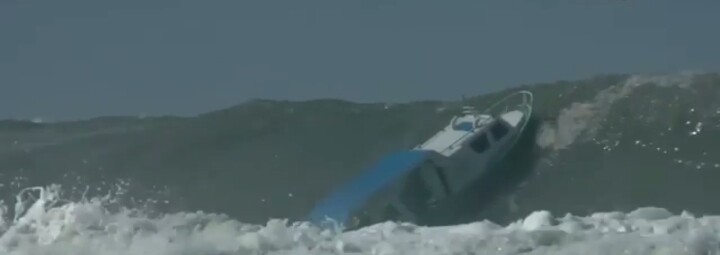 Dalam video tersebut terlihat kapal berwarna biru putih naik turun di atas ombak bahkan sampai terbalik dan tengelam di gulungan ombak.