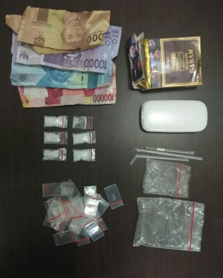 Dari tangan pelaku, tim berhasil mengamankan barang bukti 6 bungkus plastik klip kecil yang dimasukkan dalam bungkus rokok dengan berat total 4,72 gram, sejumlah plastik klip kosong belum terpakai, uang tunai senilai Rp 190 ribu dan 1 unit hp merk Sony.