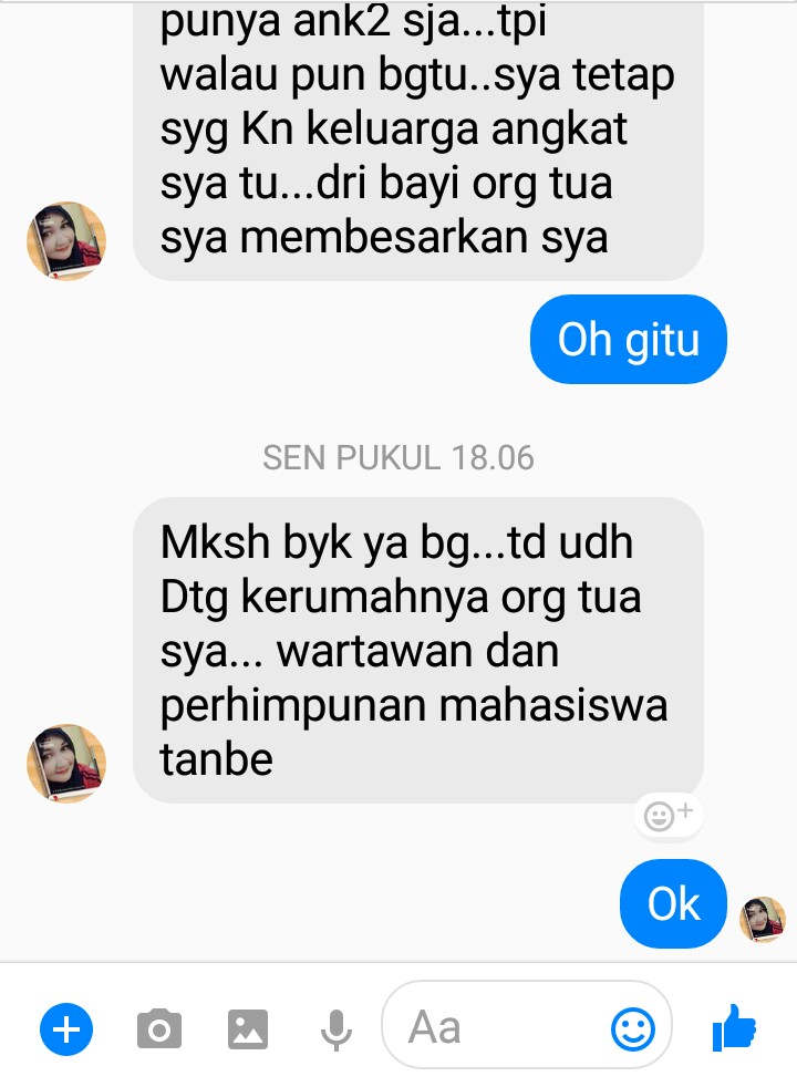 “Mksh byk ya bg…td udh Dtg kerumahnya org tua sya… wartawan dan perhimpunan mahasiswa tanbe,” ucap Sri via massenger.