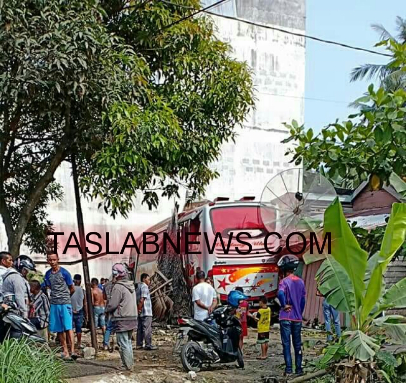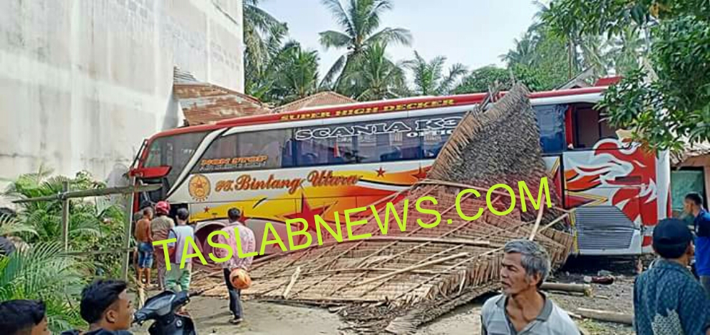 Akibatnya supir bus Bintang Utara membanting stir ke arah kanan dan menabrak tiga rumah warga serta satu unit sepedamotor yang sedang diparkir.