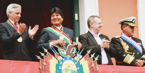 | Presiden Evo Morales (dua dari kiri) saat menggunakan medali dan selempang kenegaraan bersama pimpinan negara lain. |