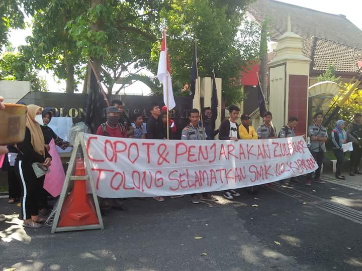 | Aksi unjukrasa menuntut kasus dugaan korupsi di SMK Negeri 2 Kisaran ditangani kejaksaan dan polisi. |