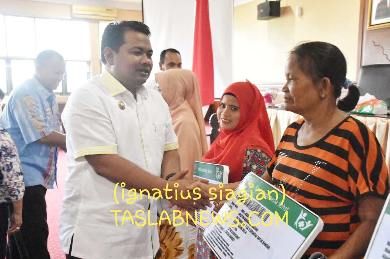 TASLABNEWS, TANJUNGBALAI – Walikota Tanjungbalai, H M Syahrial SH MH secara simbolis serahkan kartu Jaminan Kesehatan Nasional – Kartu Indonesia Sehat (JKN-KIS) Penerima Bantuan Iuran (PBI) dari dana APBD Kota Tanjungbalai Tahun 2018. Penyerahan dilakukan di Aula I Kantor Walikota Tanjungbalai, Rabu (29/8).