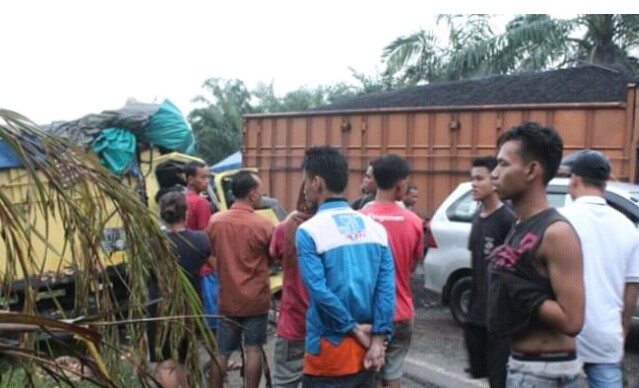 Warga menyaksikan truk vs tronton yang tabrakan di Pulau Maria Asahan. |