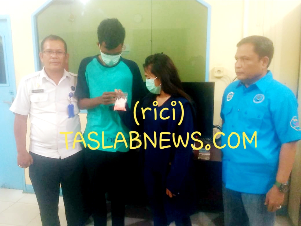 Pasangan suami istri, AM (baju hijau) dan FA (baju biru gelap) diapit petugas BNNK Tanjungbalai. |
