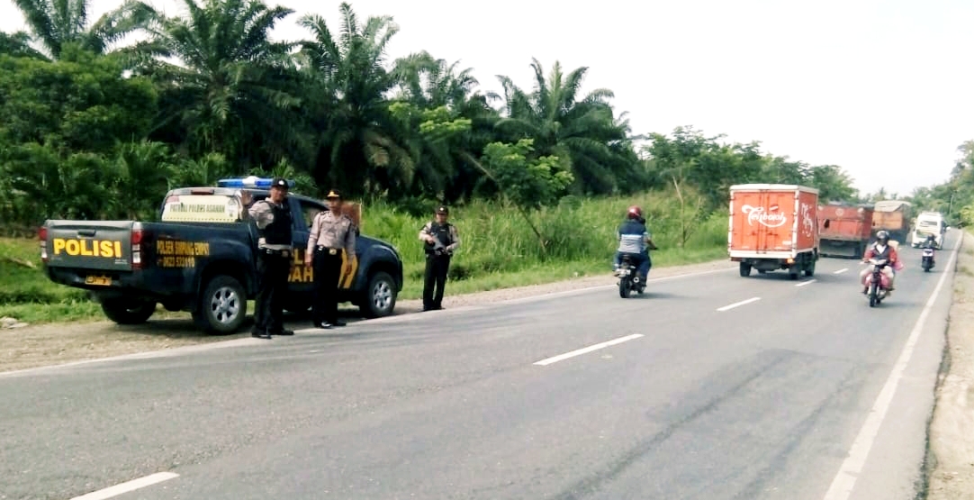 Kehadiran personil unit Sabhara Polsek Simpang Empat dan Kanit Provos Asahan mengatur arus lalin di Jalinsum simpang rumah makan Rindu Desa Perkebunan Teluk Dalam, Sabtu (22/9), membuat masyarakat dapt beraktivitas dengan lancar dan aman.
