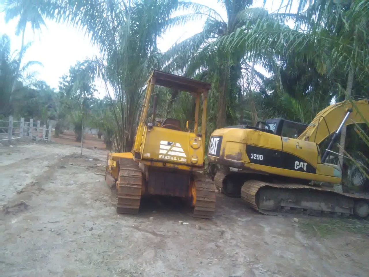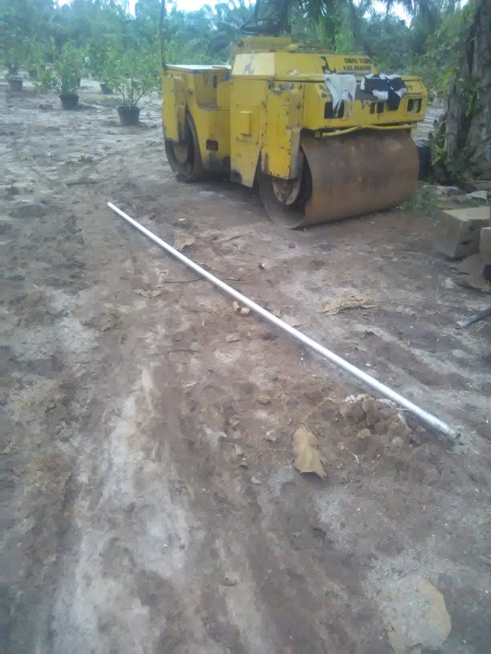 Sejumlah alat berat seperti eskavator dan grader terlihat sedang meratakan tanah berbukit di lahan yang ditanami pohon sawit, ratusan pohon jeruk, yang ditanam di dalam vas bunga.
