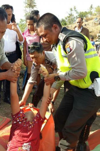 | Polisi dan tim basarnas beserta warga mengevakuasi jenazah korban. |