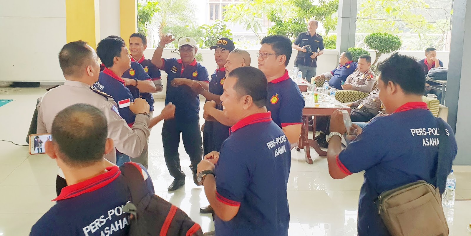 | Personil Polres Asahan berbaur dengan awak media diiringi lagu ‘Gadis atau Janda’. |