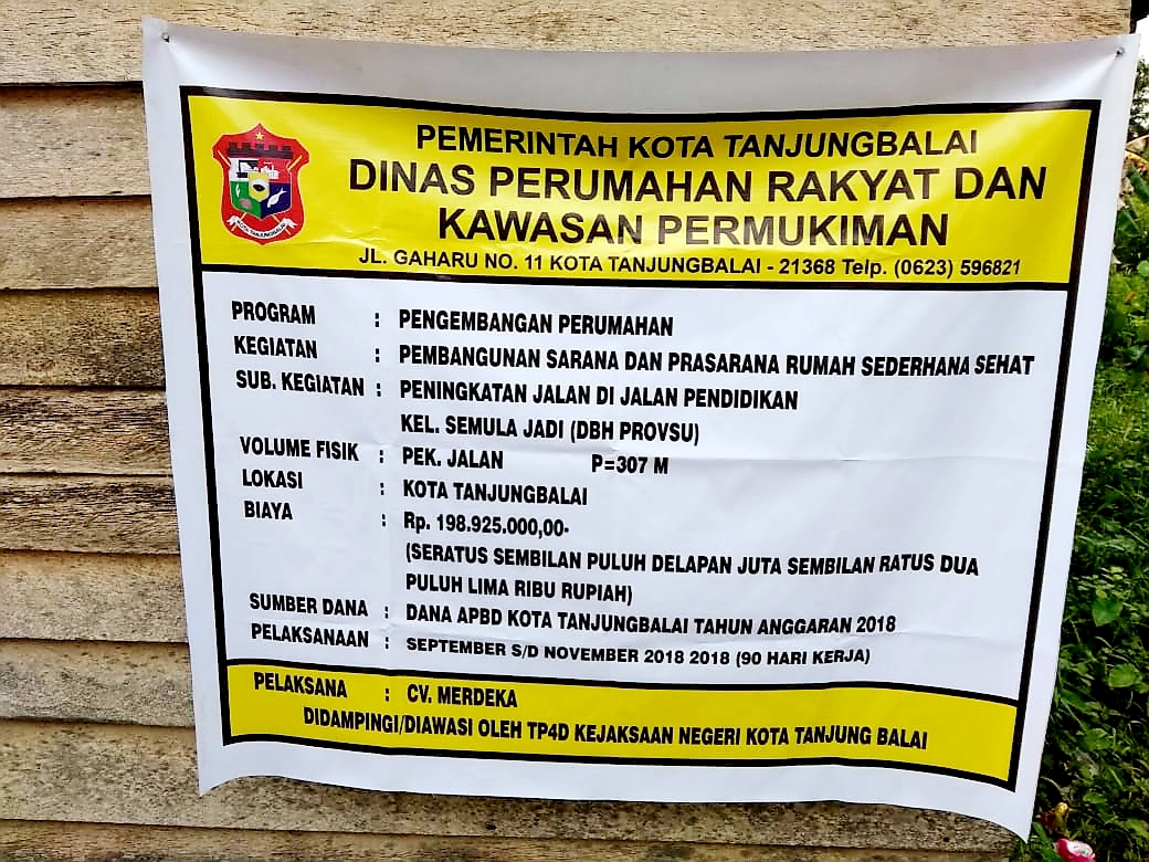 TASLABNEWS, TANJUNGABALAI – Pekerjaan jasa konstruksi peningkatan Jalan Pendidikan di Kelurahan Semula Jadi, Kecamatan Datuk Bandar Timur, Kota Tanjungbalai dengan konstruksi rabat beton ditengarai dikerjakan asal-asalan. Mirisnya, pekerjaan jasa konstruksi tersebut, menurut papan plank proyeknya, berada di bawah pengawasan TP4D dari Kejaksaan Negeri Tanjungbalai.