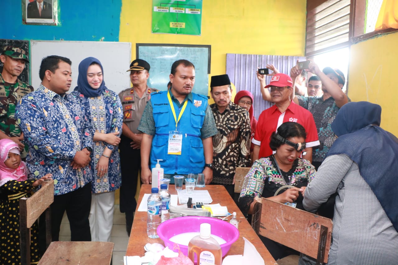 Ketua DPD KNPI Kota Tanjungbalai, Mahyaruddin Salim Batubara memperhatikan seorang masyarakat sedang menjalani pemeriksaan kesehatan, Minggu (28/10). |