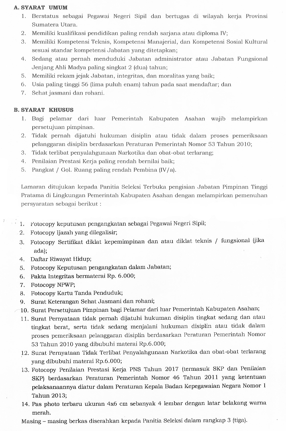Adapun Jabatan Tinggi Pratama yang akan diseleksi, yaitu Asisten Pemerintahan dan Kesejahteraan Rakyat Sekretariat Daerah Kabupaten Asahan, dan Kepala Dinas Ketenagakerjaan Kabupaten Asahan.