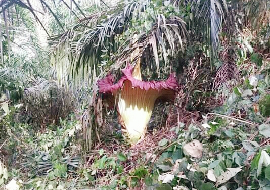 Setelah sampai di kebun, saya dikejutkan oleh pemandangan yang sangat langka. Saya melihat bunga bangkai yang tumbuh mekar di dekat batang pohon sawit.