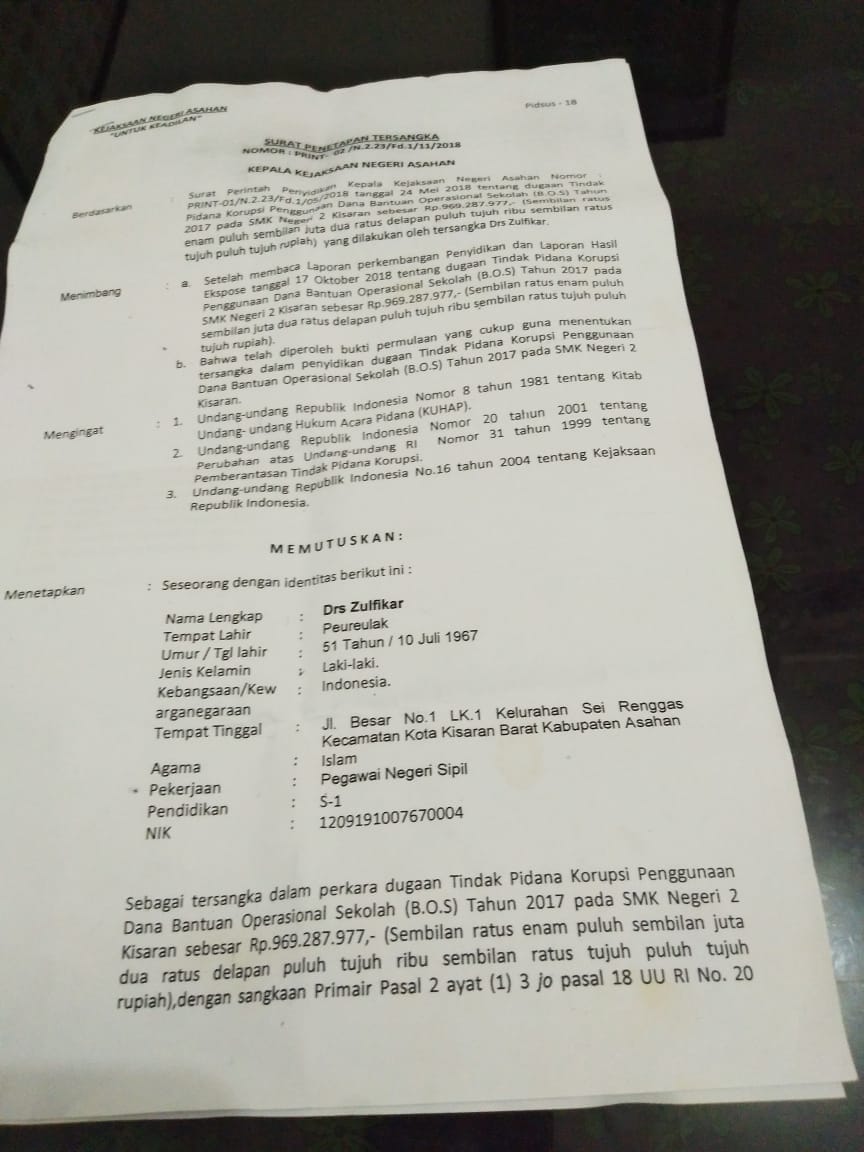 Chandra mengatakan, sesuai surat putusan dari Kejari Asahan nomor: print-01/N-2-23/fd1/05/2018 tanggal 24 Mei 2018 menetapkan bahwa Drs Zulfikar sebagai tersangka kasus dugaan korupsi dana BOS.