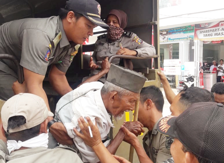 Seorang gepeng yang sudah tua berusaha melawan aparat Satpol PP saat dinaikkan ke dalam truk dalmas.