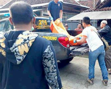 Jenazah korban saat dinaikkan ke mobil polisi untuk dibawa ke rumah sakit. |