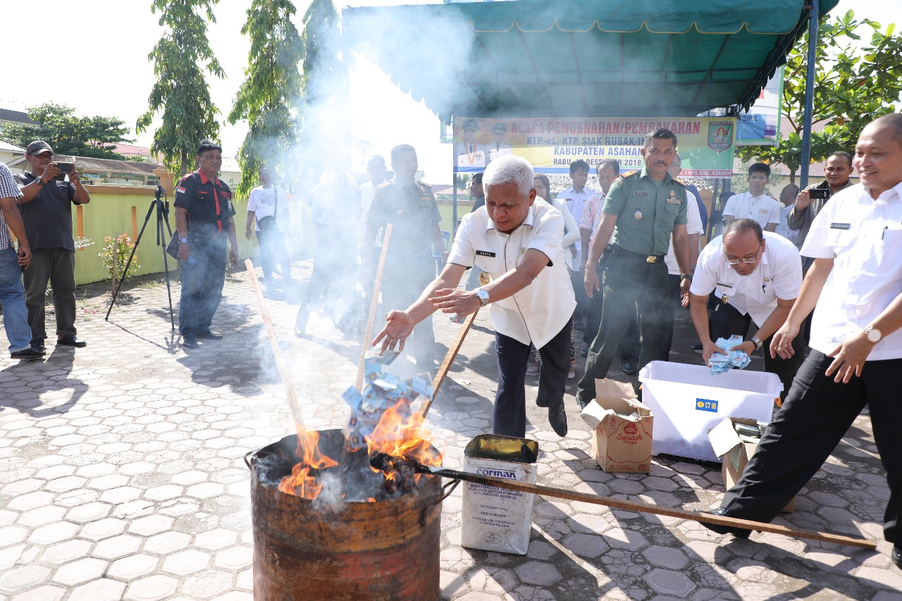 “Pemusnahan ini sesuai Surat menteri dalam negeri nomor : 470.13/1176/SJ tanggal 13 Desember 2018 tentang penatausahaan E-KTP rusak atau invalid dan sesuai arahan bapak bupati asahan,” ucap Supriyanto dalam laporannya.
