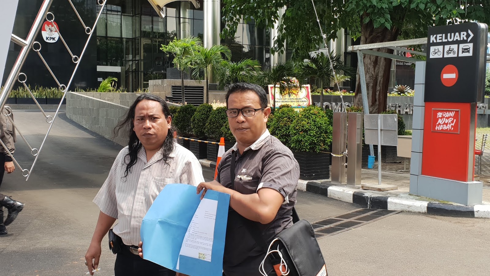Ketua DPD Granko Asahan, Ibnu Hajar Piliang menunjukkan surat pengaduan saat memasuki Gedung Merah Putih KPK. |