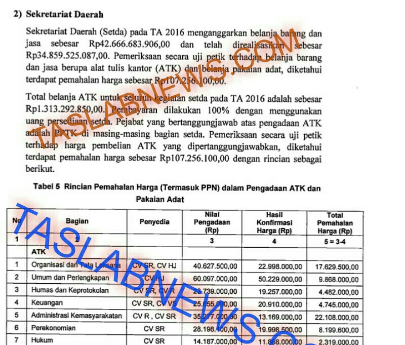 TASLABNEWS, SIMALUNGUN-Tahun anggaran 2016 Sekretariat Daerah Kabupaten Simalungun menganggarkan belanja barang dan jasa sebesar Rp42.666.683.906. Hanya saja hasil audit Badan Pemeriksa Keuangan (BPK) ada indikasi pembengkakan anggaran sebesar juta lebih.