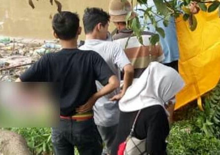Warga menyaksikan jenazah wanita yang ditemukan tewas di sungai saat melahirkan. |