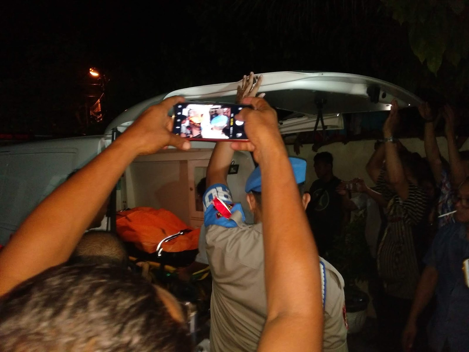 Jenazah korban dievakuasi ke mobil ambulans. |