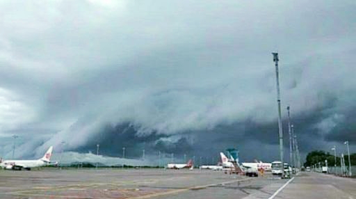 | Awan berbentuk tsunami di Kota Makasar, diabadikan di area Bandara Internasional Sultan Hasanuddin Makassar. |