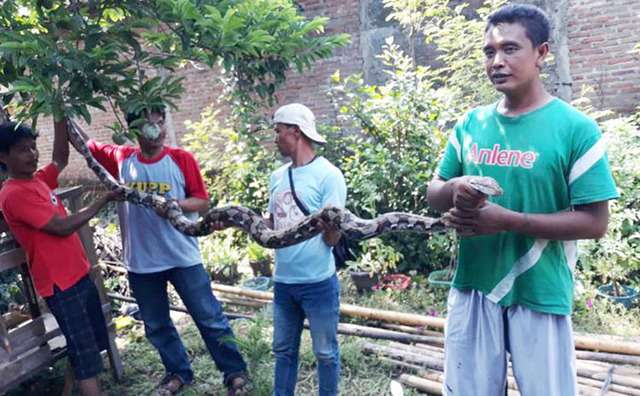 Warga memegang ular piton yang menyerang Sarjiyem dan anaknya. |