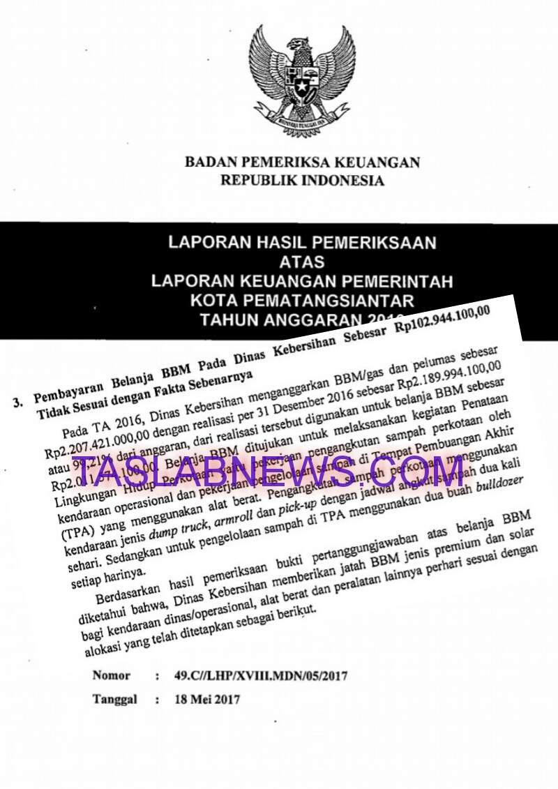 Menurut Sinaga, sesuai hasil audit Badan Pemeriksa Keuangan (BPK) RI cabang Sumatera Utara, nomor:49.C/LPH/VXIII.MDN/05/2017 tanggal 18 Mei 2017 disebutkan ada indikasi dugaan mark up dalam pembelian BBM di Dinas Kebersihan Siantar.