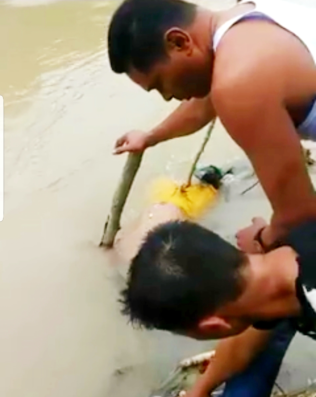 Masyarakat berusaha menggapai mayat tersebut dengan menggunakan kayu panjang dan menarik mayat ke pinggiran sungai.