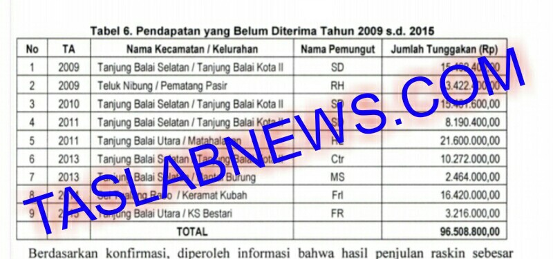 TASLABNEWS, TANJUNGBALAI- Ternyata kasus dugaan penggelapan dana raskin di Kota Tanjungbalai sudah terjadi sejak tahun 2009. Ada tujuh nama pejabat yang diduga menggunakan dana raskin untuk kepentingan pribadi yakni SD, RH, HL, CTR, MS, FRL dan FR. Total dana yang diduga digelapkan sebesar Rp96 juta lebih.