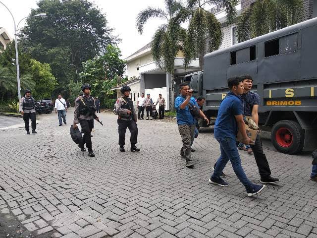 Dari balik kaca transparan, beberapa Brimob yang memegang senjata tampak menjaga ketat proses penggeledahan.