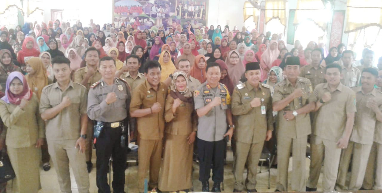 Bupati Batubara, Kapolres Batubara, Kepala Dinas Sosial Batubara, Camat, Kapolsek dan para peserta sosialisasi foto bersama.