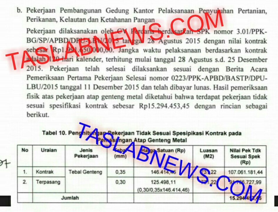 Aditia menambahkan, sesuai hasil pemeriksaan BPK, pengerjaan proyek sesuai SPK nomor:3.01/PPK-BG/SP/APBD/DPU-LBU/2015 tanggal 38 Agustus 2015 dengan nilai kontrak Rp1.991.650.000.