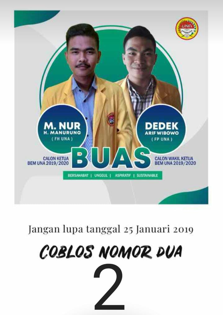 Ketua Komisi Pemilihan Raya UNA Muhammad Safrizal Adrean Pangiatu Brutu, Selasa (22/1/2019) mengatakan, pemilihan raya BEM UNA akan dilaksanakan dan calon yang sudah di verifikasi ada dua pasangan.