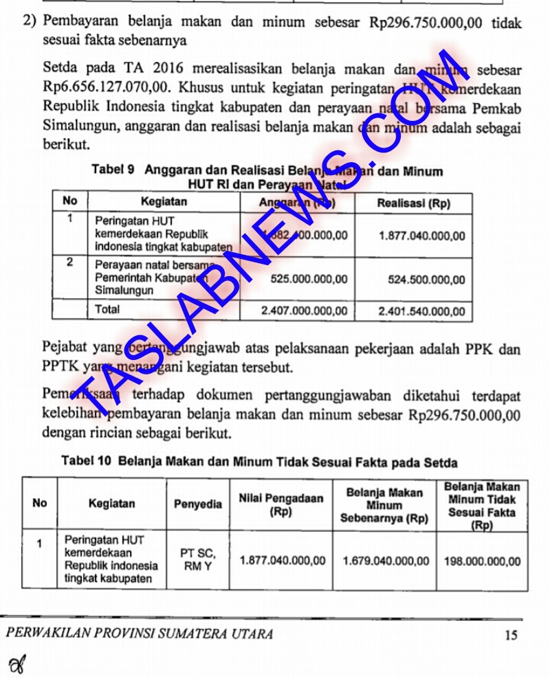 TASLABNEWS, SIMALUNGUN-Pada perayaan HUT Kemerdekaan RI dan Natal tahun 2016, Pemkab Simalungun menggelontorkan anggaran cukup besar untuk biaya makan minum.