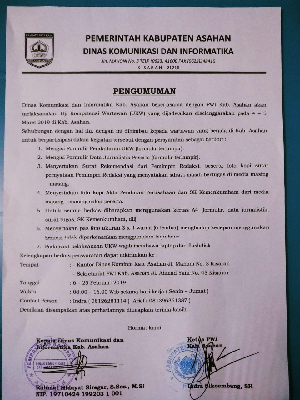 TASLABNEWS, ASAHAN-Ada kabar baik untuk para jurnalis/wartawan di wilayah Asahan. Pada tanggal 4 Maret dan 5 Maret 2019 Pemkab Asahan dan Persatuan Wartawan Indonesia (PWI) akan menggelar Uji Kompetensi Wartawan (UKW).