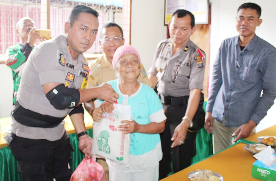 | Didampingi Camat Air Batu, Kapolres Asahan serahkan sembako kepada warga. |