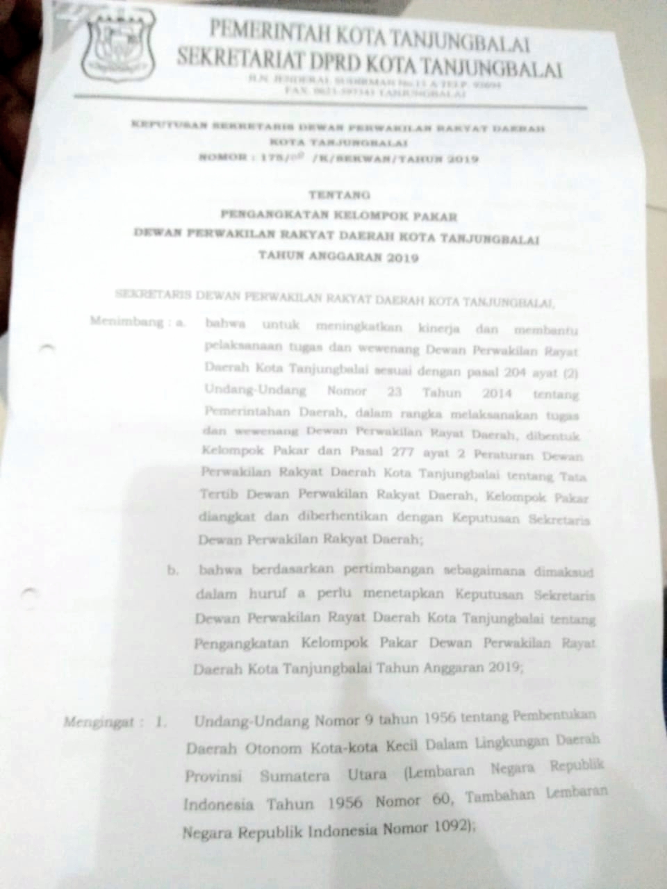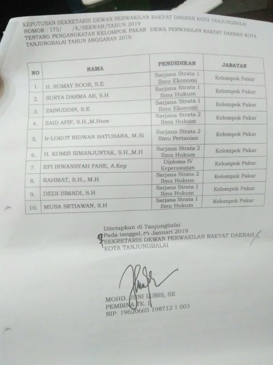 Daftar nama Kelompok Pakar DPRD Kota Tanjungbalai tahun 2019. |
