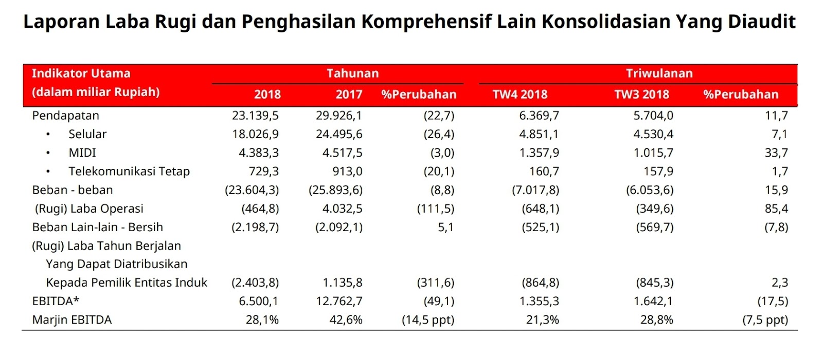 Dibandingkan dengan kinerja tahun 2017, pendapatan Perusahaan mengalami penurunan sebesar 22,7% menjadi Rp 23,1Tn dan penurunan EBITDA sebesar 49,1% menjadi Rp 6,5Tn jika dibandingkan dengan tahun sebelumnya, dengan EBITDA marjin dicatat sebesar 28.1% pada tahun 2018 ini.