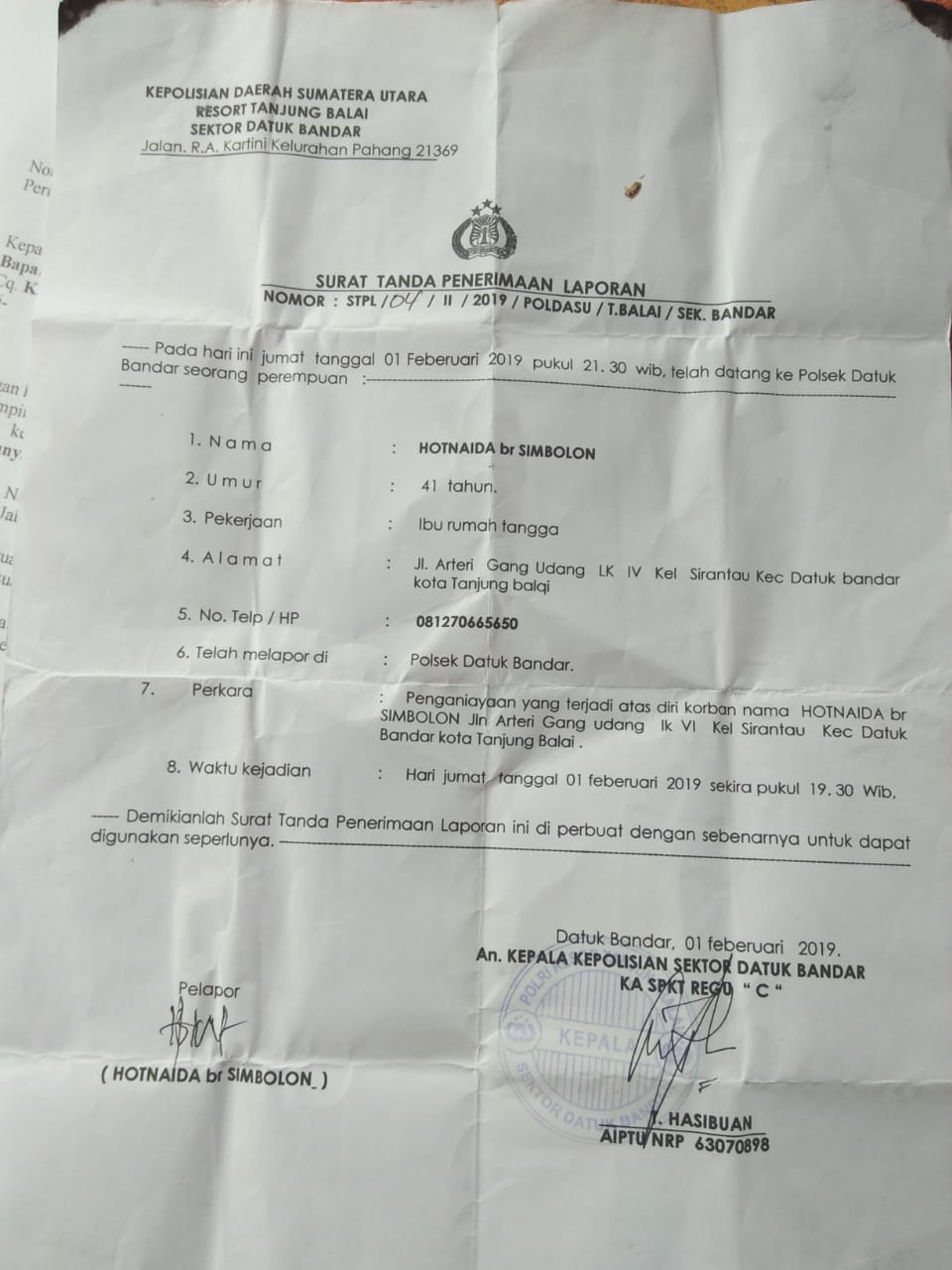 “Hotnaida boru Simbolon, warga Jalan Alteri Gang Udang Lingkungan IV, Kelurahan Sirantau, Kecamatan Datuk Bandar, Kota Tanjungbalai ini meminta saya untuk mendampinginya dalam upaya mencari keadilan terkait dengan kasus penganiayaan yang dialaminya,” urai Jaringan.