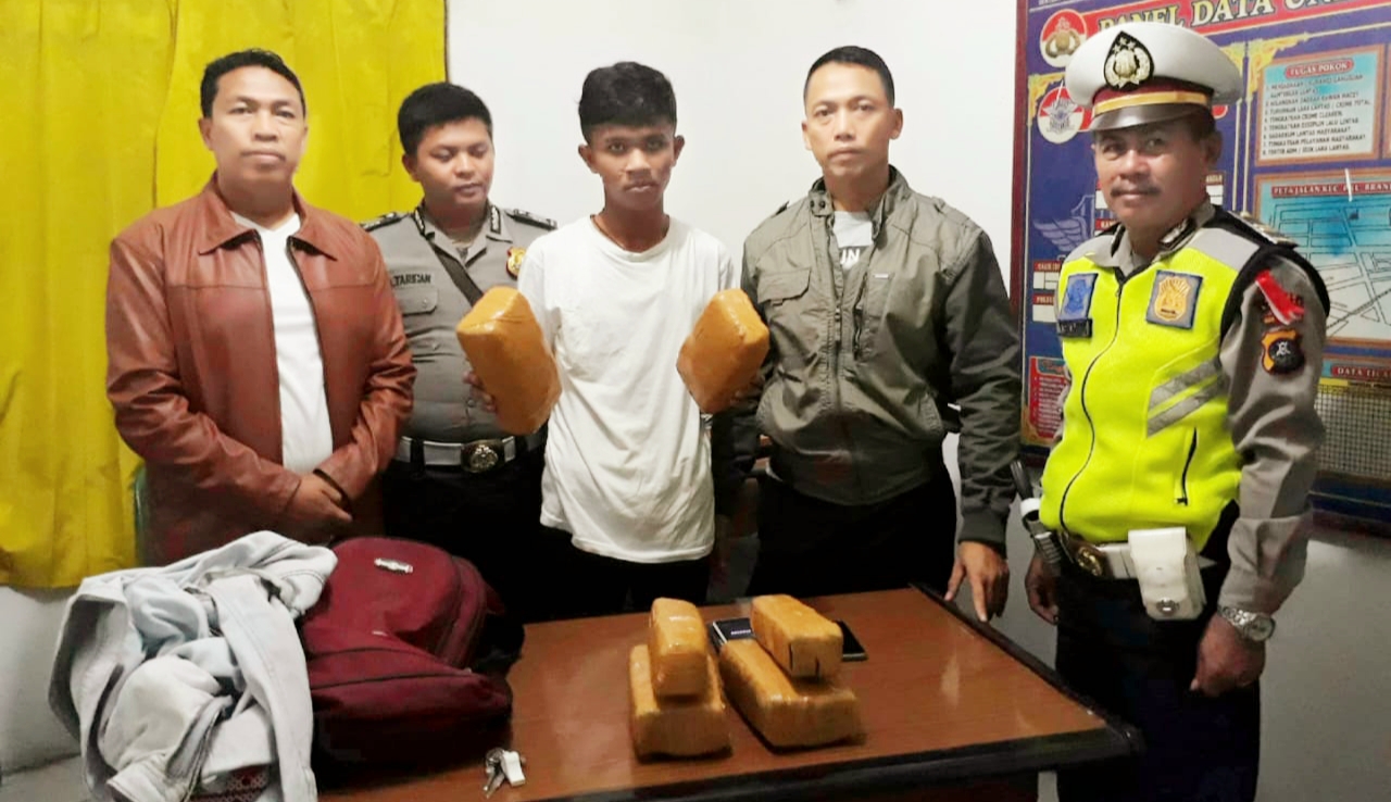 | Riski Mulia alias Riki, pengedar 5 KG Ganja asal Aceh dan barbut diamankan personil Polsek Pangkalan Brandan, Langkat. |