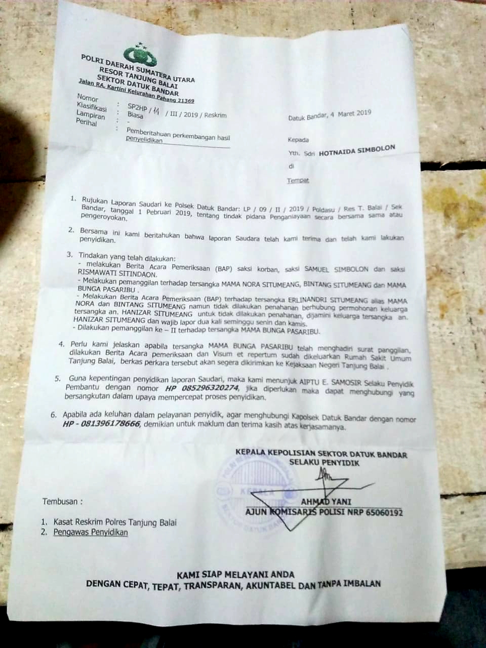 Salinan SP2HP yang disampaikan kepada korban atau pelapor Hotnaida Simbolon pada hari Selasa, tanggal 5 Maret 2019 itu, ditandatangani oleh Kapolsek Datuk Bandar, AKP Ahmad Yani, selaku penyidik.