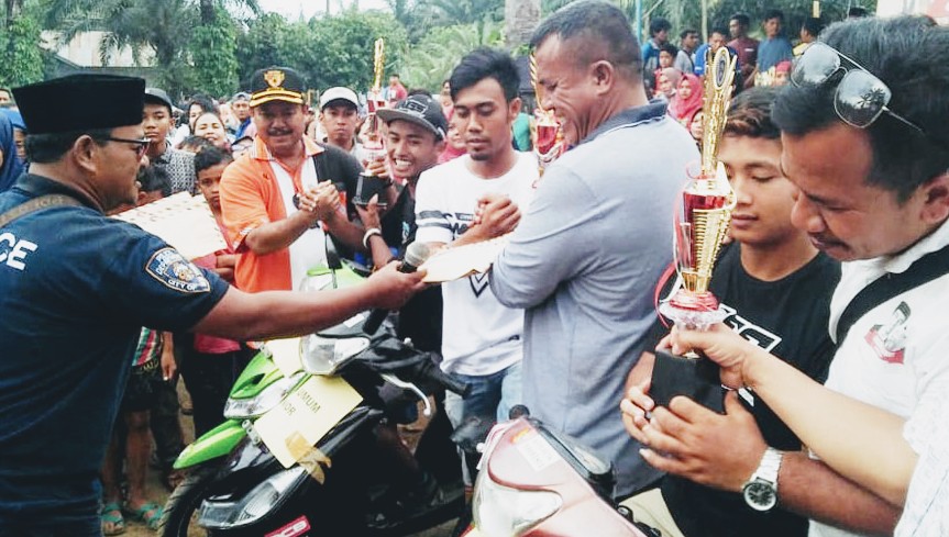 | Mangapul Purba menyerahkan hadiah pada para juara kejuaraan grasstrack. |
