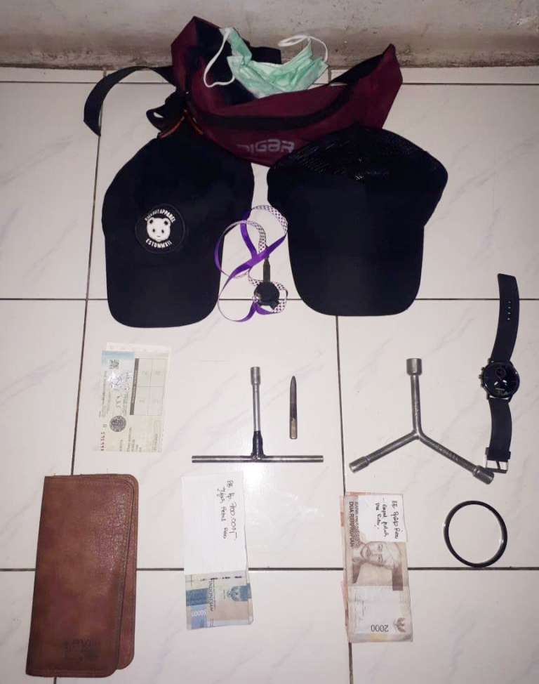 Dari tangan pelaku, disita uang tuna sisa hasil penjualan sepedamotor curian mereka sebesar Rp900.000, 2 kunci T, 2 buah topi warna hitam, dan geang hitam.