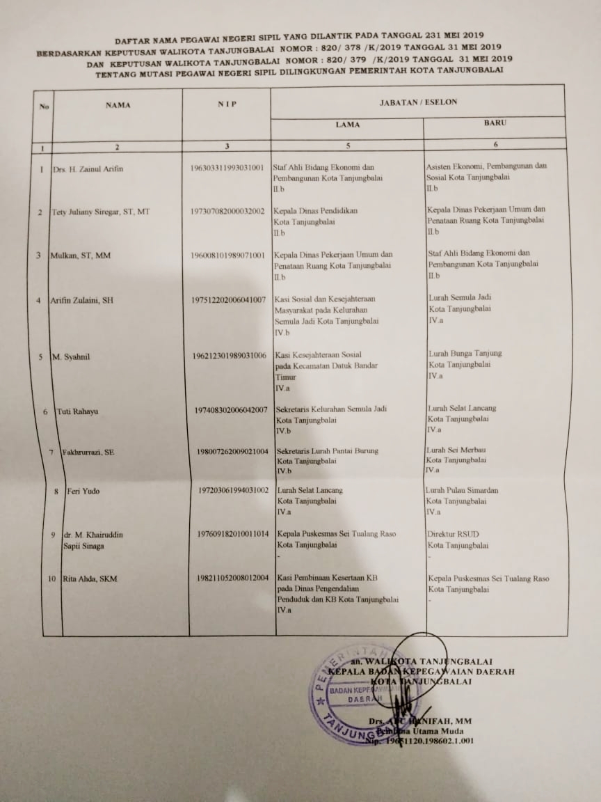 Pelantikan tersebut dilakukan berdasarkan Surat Keputusan (SK) Walikota Tanjungbalai Nomor : 820/378/K/2019 dan Nomor : 820/379/K/2019 tanggal 31 Mei 2019 tentang Mutasi Pegawai Negeri Sipil Dilingkungan Pemko Tanjungbalai. (ign/mom)