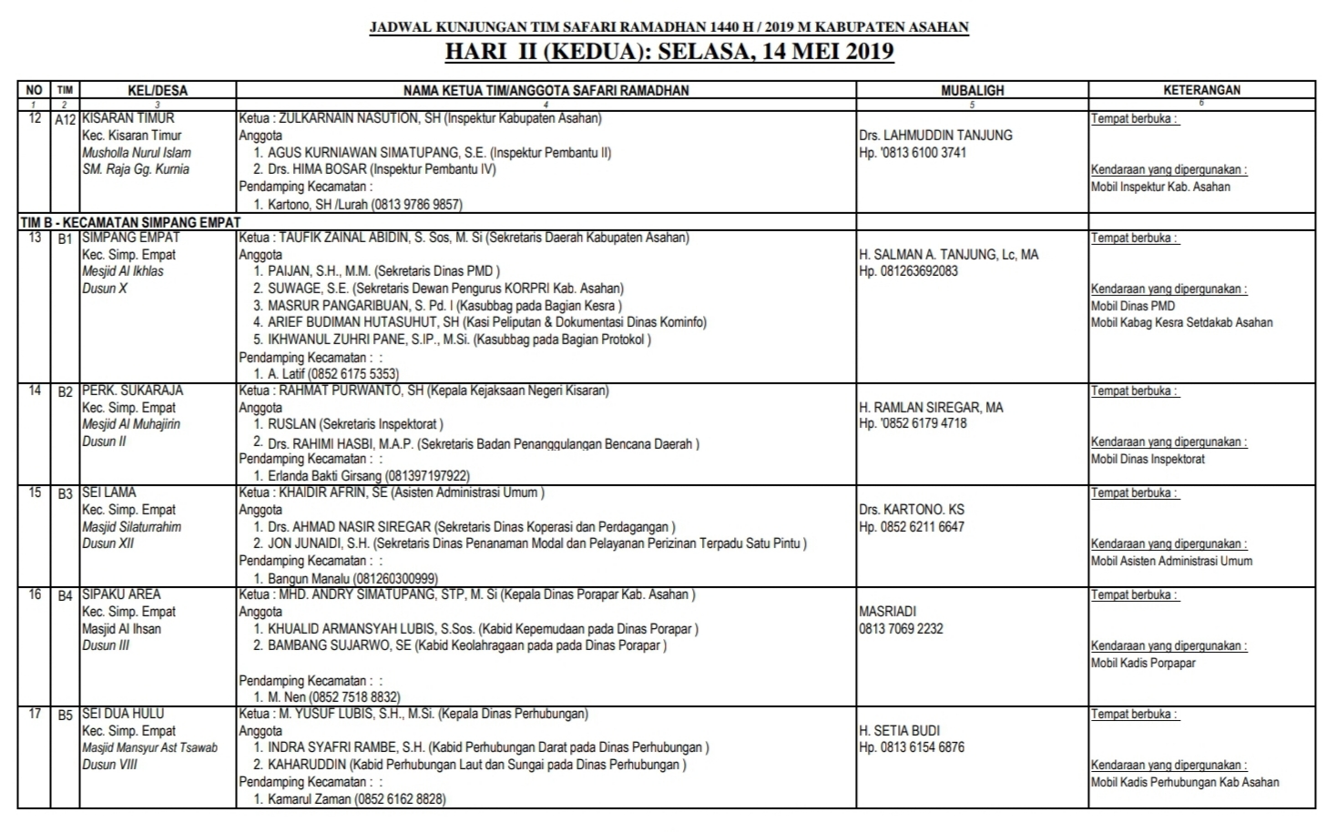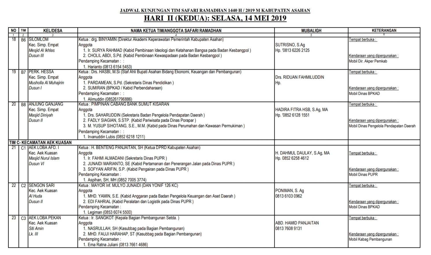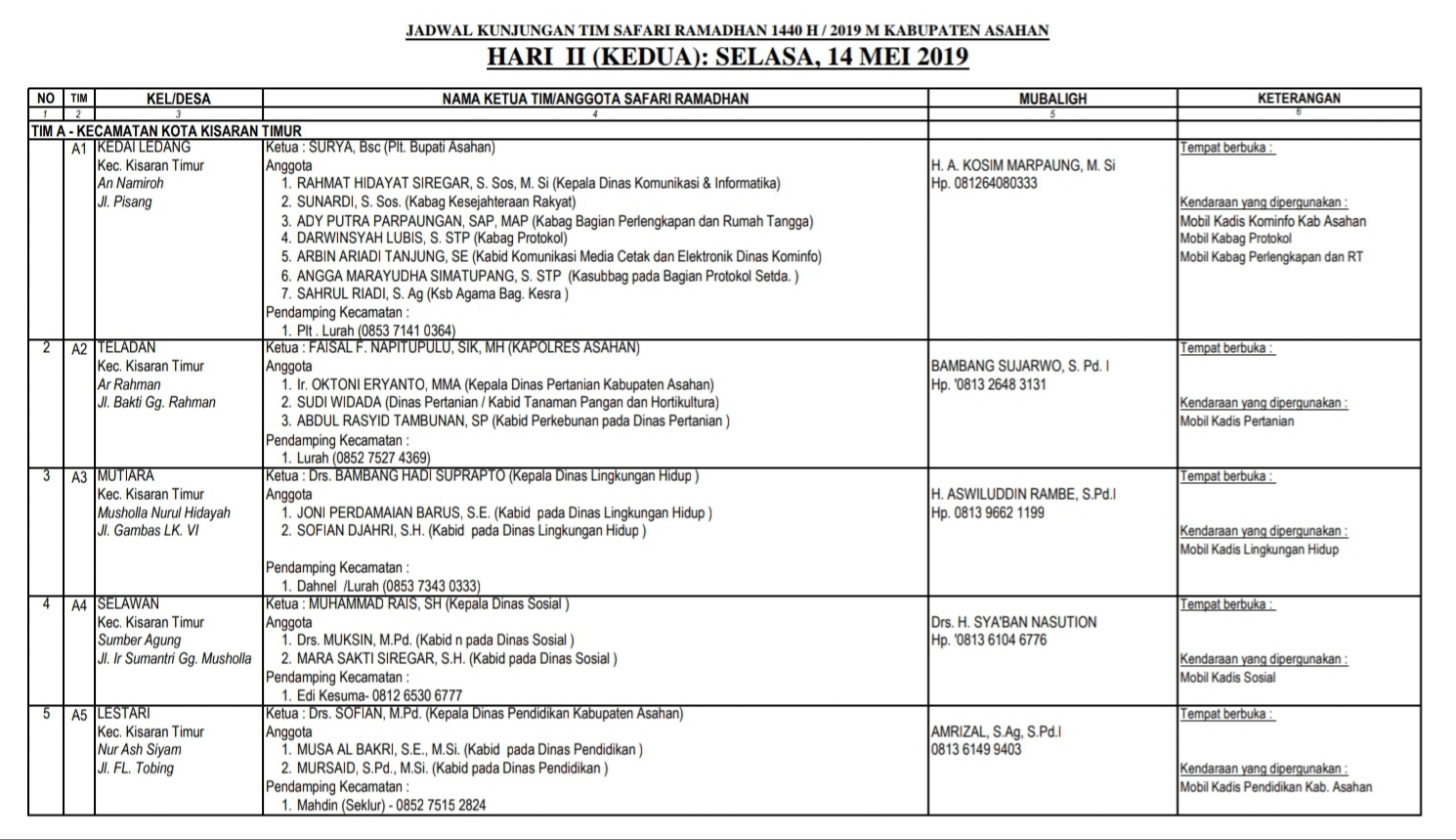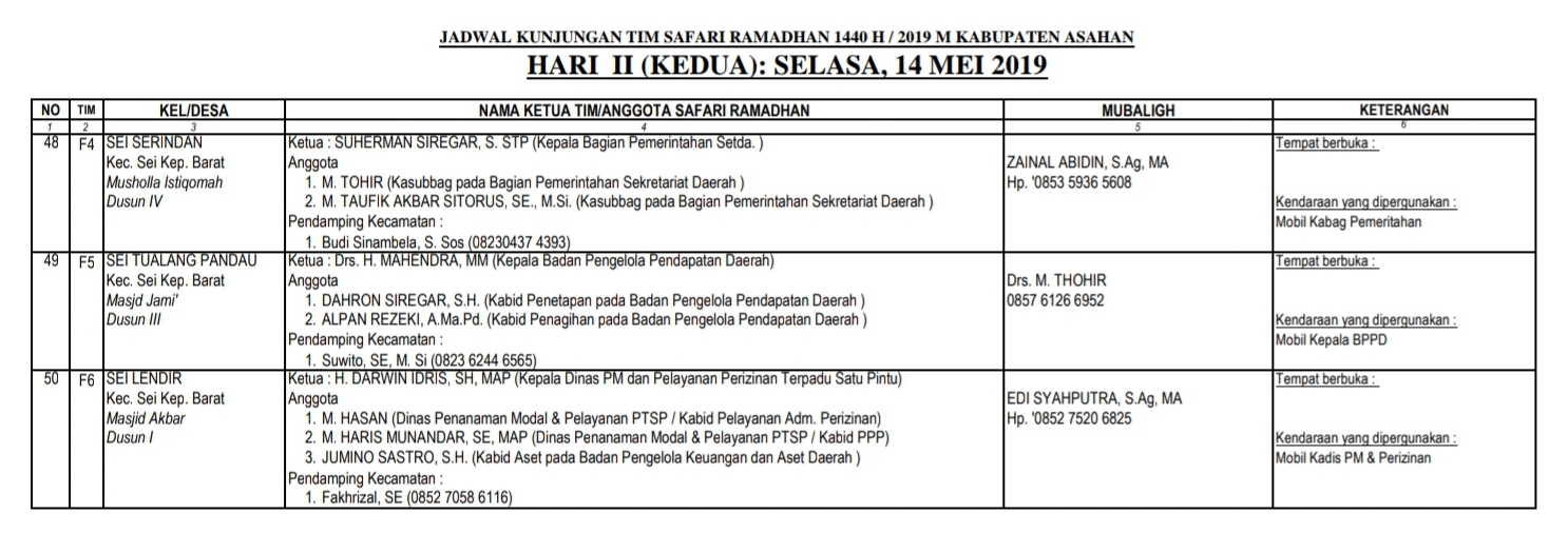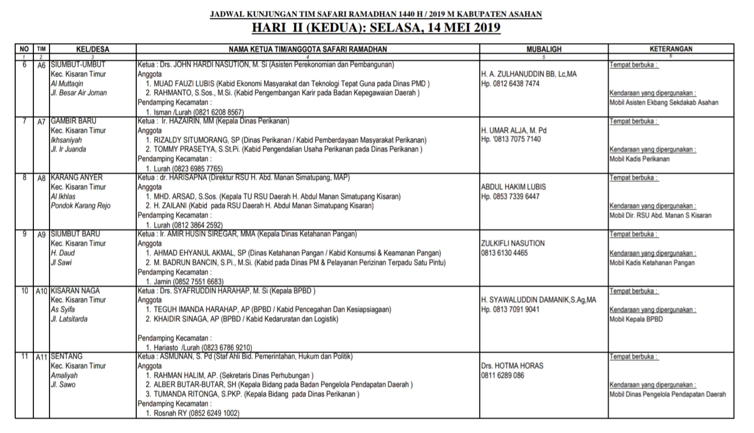 TASLABNEWS, ASAHAN – Sebagai agenda rutin tahunan, Pemerintah Kabupaten Asahan mengadakan kegiatan Safari Ramadan yang berlangsung dari tanggal 13 Mei 2019 hingga 14 Mei 2019. Kemudian dilanjutkan pada tanggal 16 Mei 2019 hingga 17 Mei 2019.