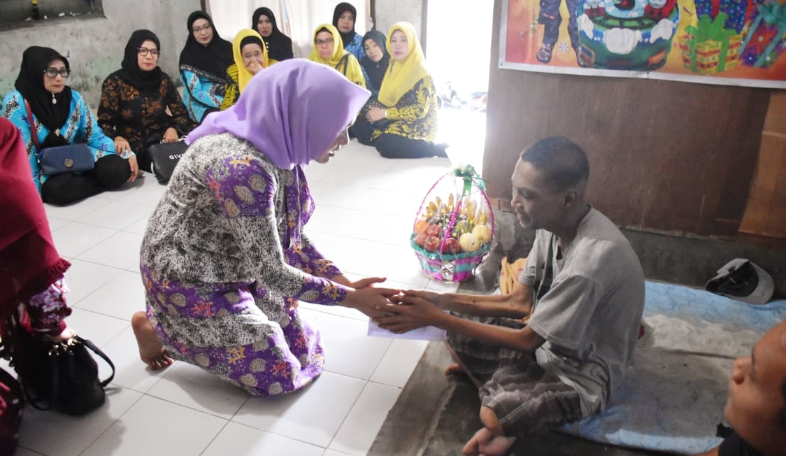 Ketua YKI Kota Tanjungbalai Ny Sri Silvisa Novita mengunjungi Gatot Jaya Perwira, penderita kanker Nasofaring. |