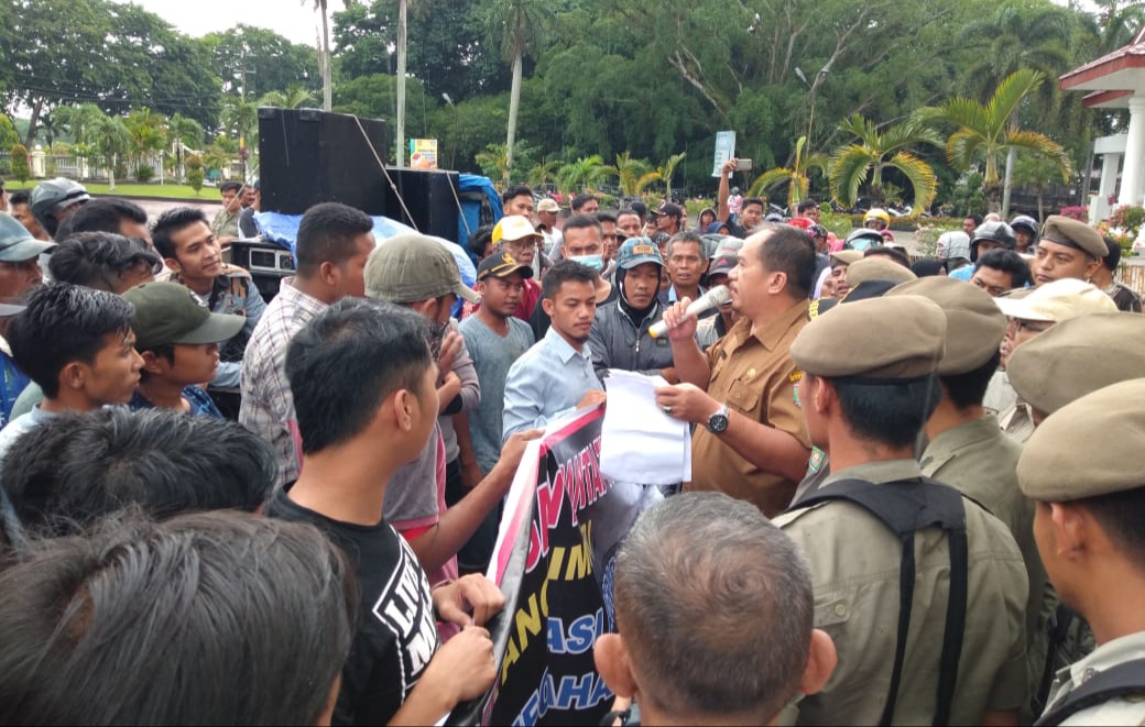 TASLABNEWS, ASAHAN – Ratusan masyarakat Kecamatan Teluk Dalam didampingi Lintas Perjuangan Masyarakat Pantai Timur (LINTANG TIMUR) dan Generasi Muda Pembela Kesatuan Tanah Air Indonesia Bersatu (GM PEKAT IB) Kabupaten Asahan, melakukan aksi unjuk rasa damai di depan Kantor Bupati Asahan (28/5/2019).