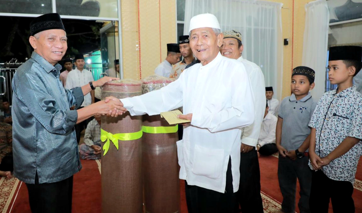 Plt Bupati juga menyerahkan bantuan kepada BKM Masjid Nurul Amin Dusun III Desa Meranti Kecamatan Meranti, berupa uang tunai serta sajadah, yang diterima langsung Ketua BKM Mesjid Nurul Amin, Suratmin.