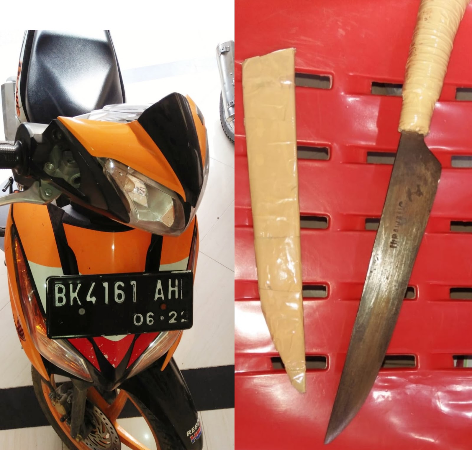 Dari hasil penggeledahan terhadap pelaku, personel menemukan satu pisau, selanjutnya pelaku dibawa ke Mapolsek untuk di interogasi.